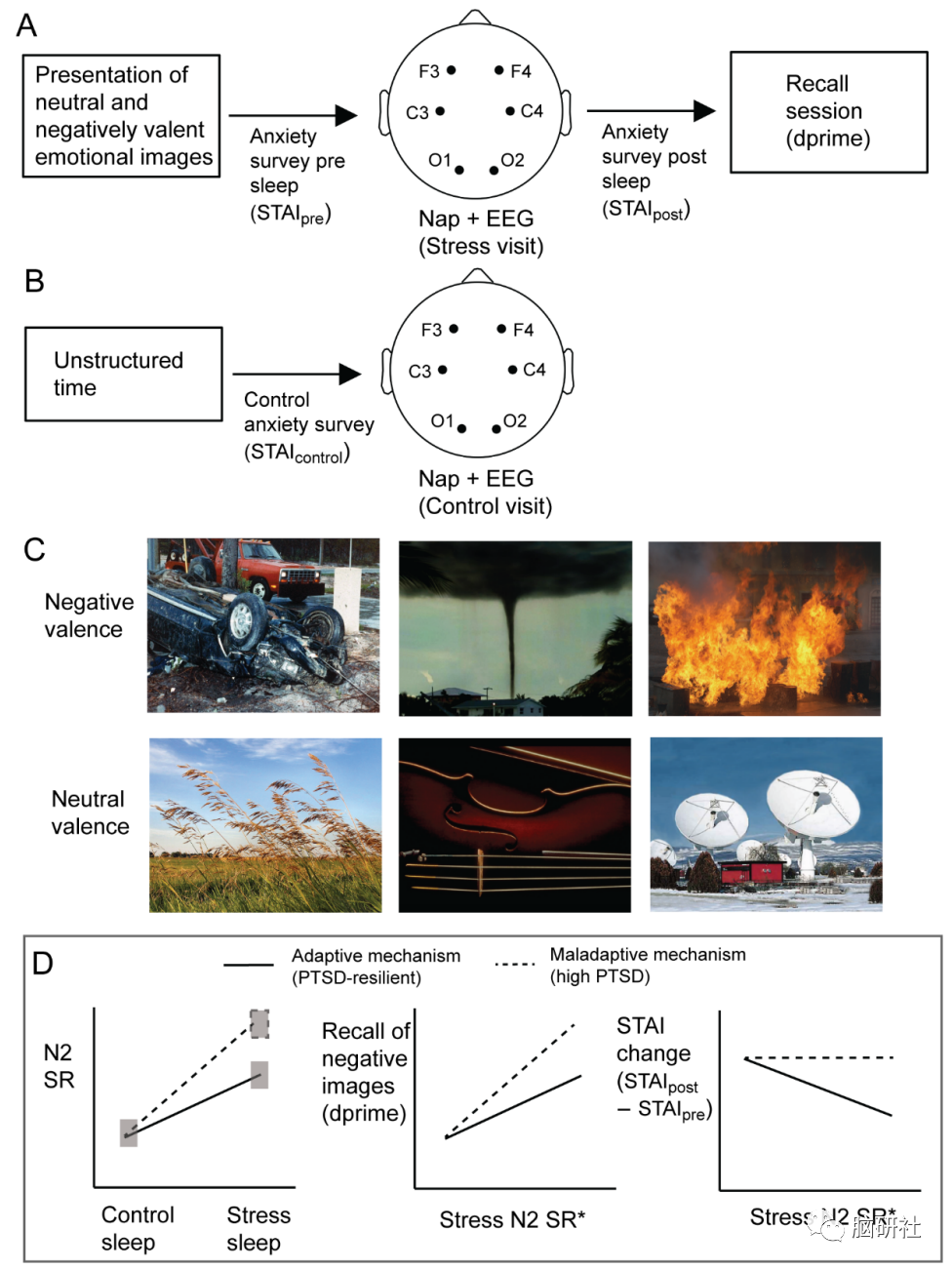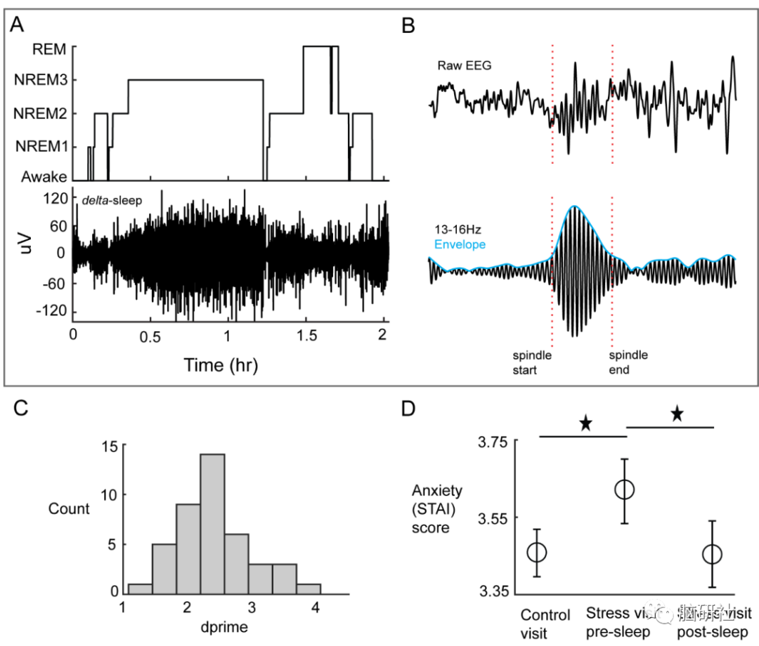 开放转载,欢迎大家转发到朋友圈和微信群创伤后应激障碍(PTSD)是一种创伤引起的衰弱性疾病,主要是以创伤相关的焦虑、过度觉醒以及以高度不安的睡眠为特征。由此,睡眠被认为是创伤后应激障碍的标志之一,例如,PTSD患者的频繁噩梦就具有可诊断的病理学特征。2023年5月6日,加州大学的Nikhilesh Natraj 博士所在的研究团队在 Biological Psychiatry: Cognitive Neuroscience and Neuroimaging (IF=6.050)上发表了题为“Sleep Spindles Favor Emotion Regulation Over Memory Consolidation of Stressors in Posttraumatic Stress Disorder”的文章表明,睡眠纺锤波(即睡眠的一个阶段发生的大脑活动的短暂爆发,能够被脑电图(EEG)捕捉到)可能会调节创伤后应激障碍(PTSD)患者的焦虑。该研究揭示了纺锤波在缓解创伤后应激障碍焦虑中的作用,并证实了它们在将新信息转移到长期记忆存储中的既定作用。这些发现挑战了其他研究人员最近的研究,因为他们的研究表明纺锤波可能会增强创伤后应激障碍患者的侵入性和暴力想法。研究人员认为,“这些发现可能不仅对创伤后应激障碍患者有意义,而且可能对焦虑症患者有意义,因为,本研究的结果认为,有一些非侵入性的方法可以利用这个睡眠阶段的好处来缓解症状。”研究人员招募了 45 名经历过战斗或非战斗创伤的被试,;大约一半有中度创伤后应激障碍症状,另一半症状较轻或无症状。研究人员研究了其在非快速眼动睡眠(NREM2)期间的纺锤波,而纺锤波主要发生的睡眠阶段,约占总睡眠的50%。
