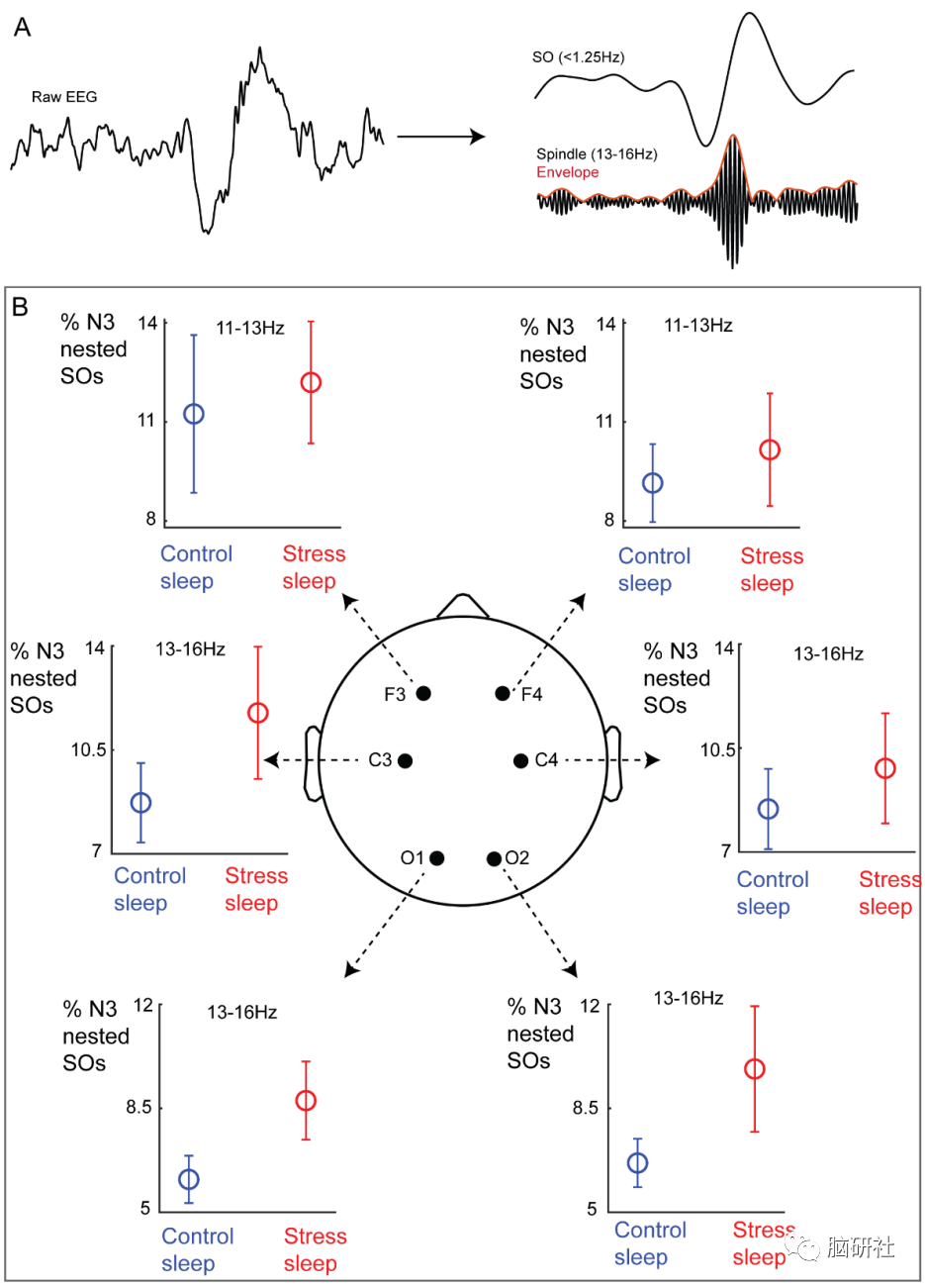 研究人员发现,压力访问期间的纺锤波速率频率高于对照组。研究人员解释说,“这提供了令人信服的证据,证明压力是纺锤波特异性睡眠节律变化的一个促成因素,”此外,值得注意的是,在创伤后应激障碍症状较严重的被试中,压力暴露后,增加的纺锤波频率能够减少小睡后的焦虑。
