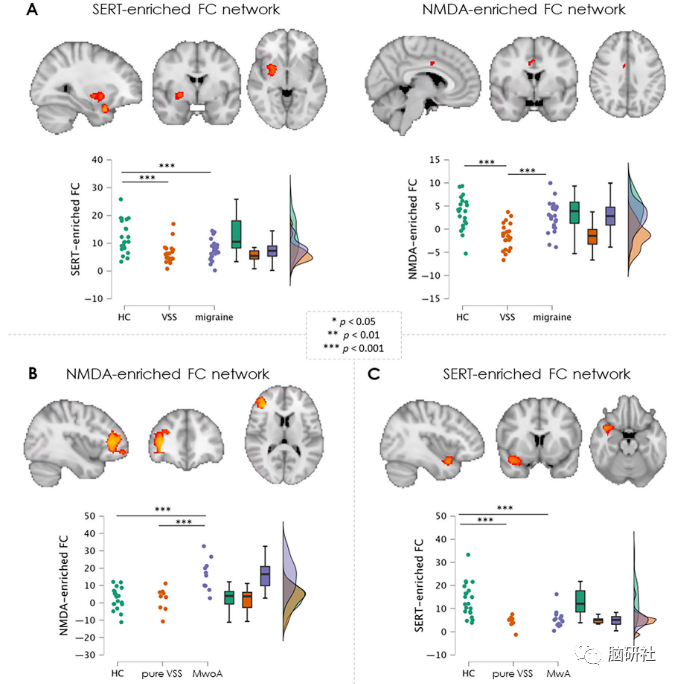 分析还显示,与健康对照组相比,VSS患者在大脑视觉皮层(visual cortex)、岛叶(insula)、颞极(temporal pole)和眶额叶(orbitofrontal areas)区域的功能连接减少,在偏头痛患者中也观察到这种连接的减少。这表明VSS患者的血清素活性可能会影响复杂感觉信息的整合。