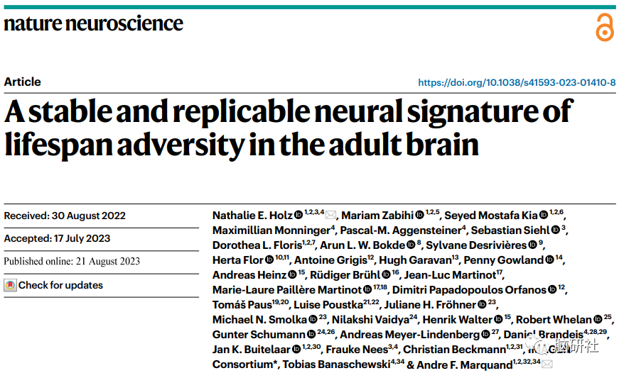 你的大脑是由你所经历的事情塑造的。这听起来合乎逻辑,但你真的能衡量吗?你能用它做什么?有证据表明,环境逆境是构成精神疾病的潜在危险因素。大脑适应逆境可能是根据逆境的不同类型而采用不同的方式。然而,逆境对大脑结构的长期影响以及个体神经生物学异质性与行为的关系尚未得到阐明。2023年8月21日,拉德堡德奈梅亨大学的Nathalie E. Holz博士和Andre F. Marquand博士及其研究团队在Nature Neuroscience(IF=25.0)上发表了题为“A stable and replicable neural signature of
