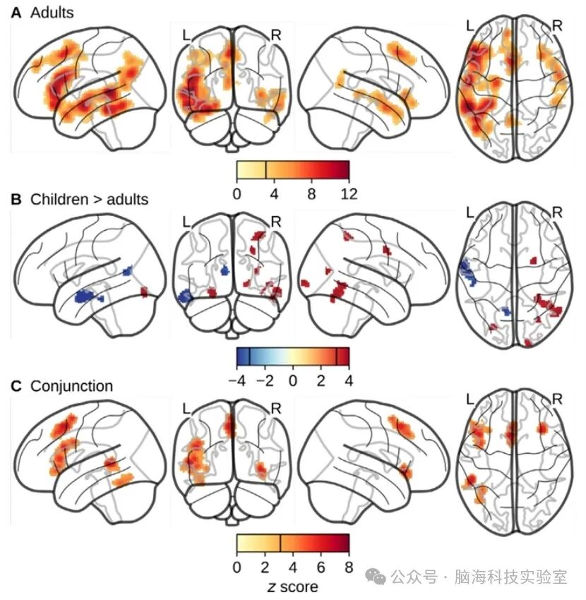 (A) 重现Jackson(2021)的元分析,综合了415个成人一般语义认知的fMRI实验。为了进行组别比较,这次重现使用了与正文和图4B中儿童相同的数据分析程序和统计阈值。(B) 儿童和成人语义认知的ALE图之间的比较,体素水平上的阈值设定为 p < .001(未校正),团块水平上阈值设定为 k > 25个相连体素(200立方毫米)。(C) 连结分析显示仅对儿童和成人都显著的体素。在这里,颜色表示两个单独组别图中每个显著体素的最小z分数。
