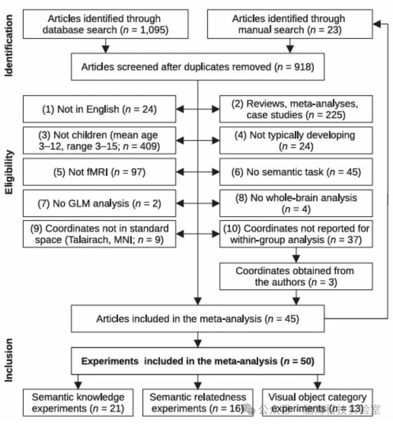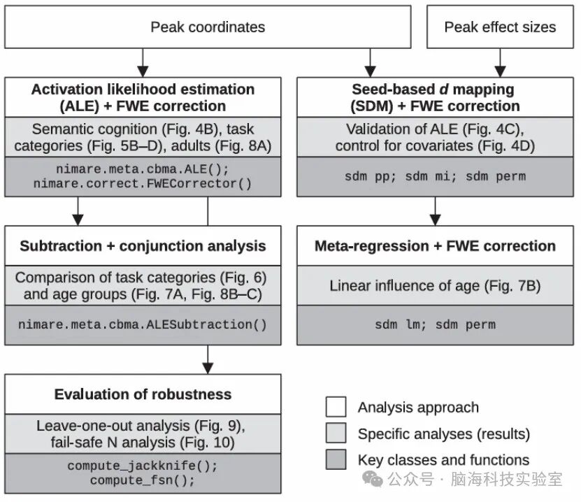 本研究采用了两种元分析方法(激活似然估计和基于种子点的d映射)来确定与儿童语义认知相关的fMRI激活峰值的重叠。通过执行减法分析、连结分析和元回归分析,我们检验了调节变量(例如,语义任务类别、平均年龄)的影响,并将我们的结果与以往在成人样本中获得的发现进行比较。最后,我们进行了留一法和失效安全N分析,以探究元分析结果对不同类型出版偏倚的稳健性。所有分析的Python代码可在可补充材料中找到,链接为https://osf.io/34ry2/。FWE = 家族错误率,Fig. = 图。
