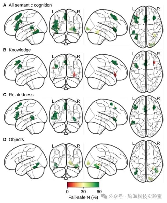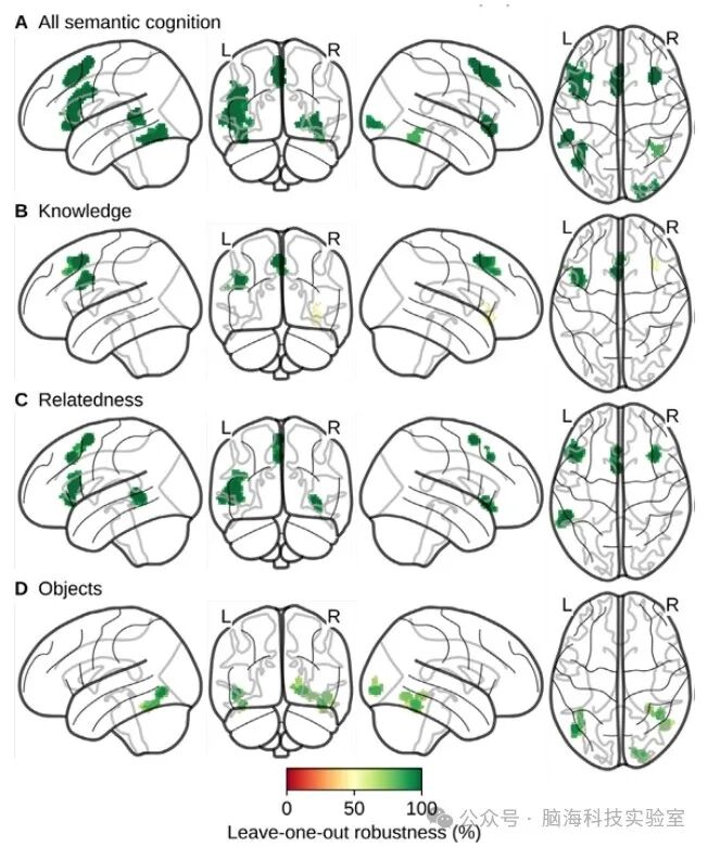 留一法程序显示,主分析中检测到的所有团块对删除个别研究均具有稳健性,八个团块的平均留一法稳健性为96%(范围84-100%;见图9)。对于语义相关性实验的子分析,所有四个团块的稳健性均为100%,而对于语义知识实验,团块#1和#2的稳健性为100%,但团块#3(右侧岛叶;48%)和团块#4(左侧额下回;81%)的稳健性有所降低。最后,对于视觉语义对象类别实验,所有三个团块的稳健性略有降低(85%)。总体而言,这反映了元分析对虚假实验的整体稳健性良好,尽管对于基于较少实验运行的子分析,这种稳健性略有损害。