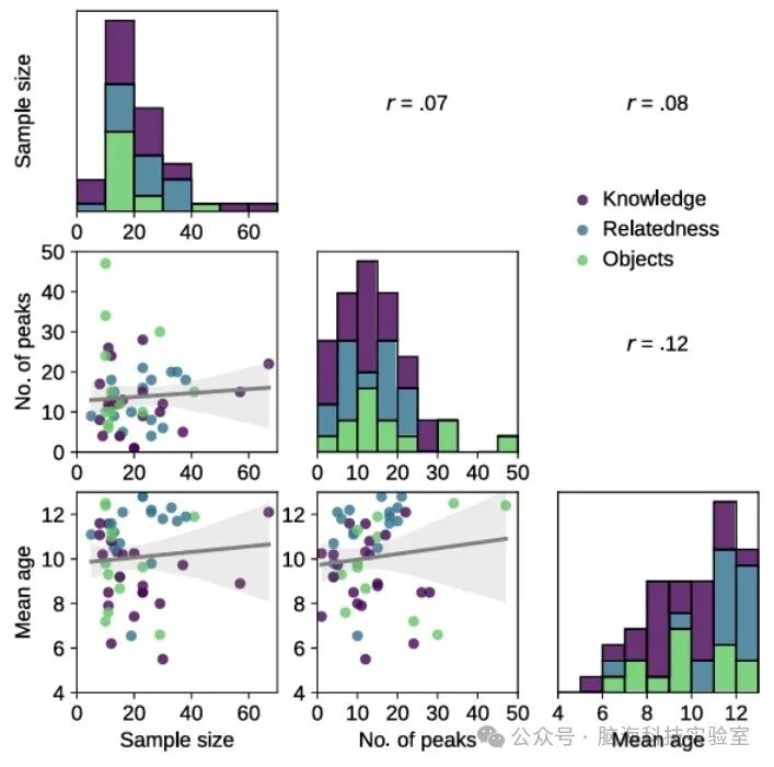 主对角线上的直方图展示了元分析中实验的分布情况,这些实验根据其样本量、报告的峰值数目以及研究对象儿童的平均年龄进行分组。非对角线上的散点图和相关系数展示了这些实验级别特征之间的双变量关联。灰色线条表示线性回归趋势及其95%置信区间。“编号”表示数量。