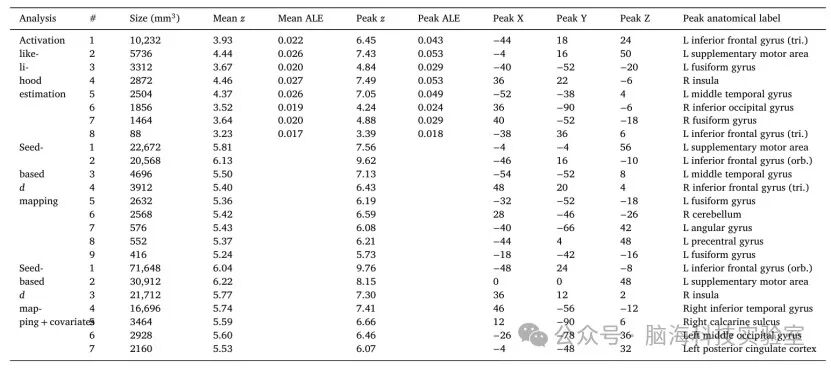 注:峰值基于解剖自动标记图谱(AAL2; Rolls et al., 2015)。# = 团块ID,L = 左侧,R = 右侧,tri. = 三角部,orb. = 眶部。