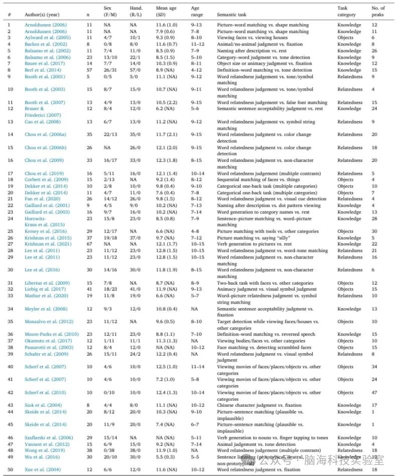 截至2020年7月,通过在线文献数据库搜索,共获得45篇文章报告了50个独立的儿童语义认知fMRI实验(见图1和表1)。这些实验可以进一步分为探测语义世界知识(n=21)、语义相关性判断(n=16)和视觉语义对象类别辨别(n=13)的实验。这些实验共包含1018名儿童的fMRI数据(每个实验平均20.4人,中位数15.5,范围5-67;见图3),平均年龄为10.1岁(平均年龄范围5.5-12.8岁,总年龄范围4-15岁)。根据原始文章,这些儿童中有54.4%是男孩(45.6%是女孩),98.4%是右利手(1.6%是左利手)。这些实验共报告了687个激活峰值(每个实验平均13.7个,中位数12,范围1-47),并纳入了元分析。在这些峰值中,有400个(58.2%)位于左半球(x MNI < 0),表明了轻微的侧化程度。实验间样本量、被研究儿童的平均年龄和报告的峰值数量之间没有可靠的关联(见图3)。关于实验的额外描述性信息可以在附录A中找到。