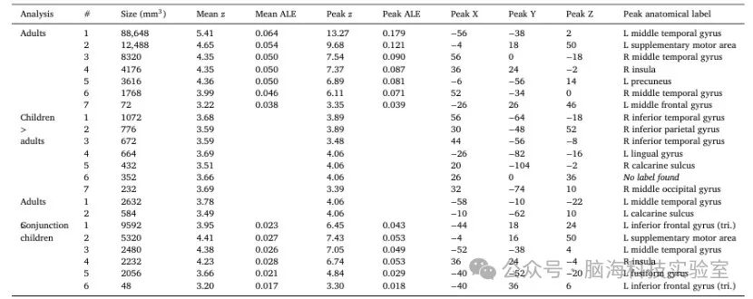 基于效应量的方法不仅作为主要(ALE)分析的稳健性检查,而且还使得在控制四个不同线性协变量(即实验的语言、刺激呈现方式、儿童响应方式和用于数据分析的统计软件包)的同时重新评估结果成为可能。这也产生了定性相似的结果,尽管在没有协变量的原始分析中,团块更大(见图4D和表2)。