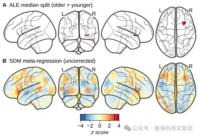 (A) 平均样本年龄大于元分析中位数(10.3岁)的实验的ALE图与平均样本年龄小于该中位数的实验的ALE图进行了对比。得到的减法图在体素水平上的阈值设定为 p < .001(未校正),在团块水平上阈值设定为 k > 25个相连体素(200立方毫米)。(B) 元回归检验平均样本年龄对元分析效应量的线性影响。由于没有任何体素达到了预先设定的统计阈值(体素水平上的 p < .001 [FWE校正] 和团块水平上的 k > 25个相连体素 [200立方毫米]),我们以探索性的方式呈现未校正且未阈值化的z分数图,并作为未来研究的起点。