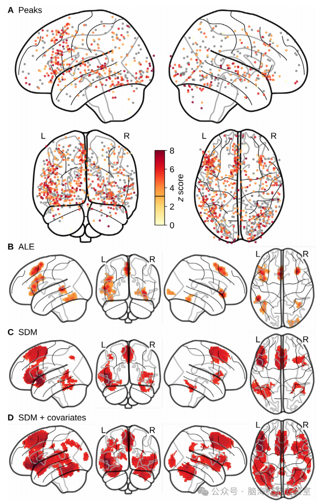 这两种不同元分析算法的结果之间有三个值得注意的差异:(a) 与ALE相比,SDM的整体显著团块的大小更大,(b) 在ALE中观察到一个位于右侧视觉皮层的团块,但在SDM中未观察到,以及 (c) 在SDM中观察到一个位于左侧角回的团块,但在ALE中未观察到