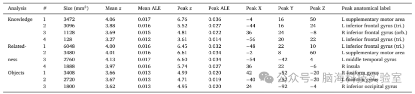 除了映射与儿童一般和任务特定语义认知相关的皮层网络外,还进行了元分析减法分析,以测试三种不同任务类别(即知识、相关性和对象)之间的可靠差异。对于这种类型的分析,一个ALE图(例如,语义知识实验的图)从一个ALE图(例如,语义相关性和视觉对象类别实验的合并图)中减去。然后,将得到的差分图与通过将原始实验随机重新分组20,000次成新组获得的这种差异图的经验零分布进行比较。与这个零分布相比,p < .001(未校正)的体素并形成至少25个体素(200立方毫米)的团块被认为是显示任务类别之间可靠差异的。此外,还进行了元分析连结分析,以识别在所有三个任务类别中共享的认知处理区域。这是通过取所有三个任务特定ALE图的每个体素的最小ALE值来完成的——但仅限于在三个中的每一个中都具有统计显著性的体素。