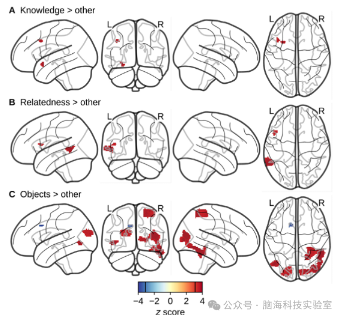 这些特定任务的元分析图相互对比,以检查它们在何处相互差异(见图6和表4)。首先,探测语义知识的实验比其他两个任务类别在左侧岛叶和中额皮层的两个小团块中显示出更一致的激活。其次,探测语义相关性的任务比其他两个任务类别在左侧额下回的眶部和左侧中颞叶显示出更一致的激活。最后,探测视觉语义对象类别的任务比其他两个任务类别在双侧枕叶和梭状回皮层以及右侧上顶皮层显示出更一致的激活。它们还在左侧内侧额叶的一个小团块中比其他两个任务类别显示出更少的激活(在图6C中以蓝色显示)。连结分析揭示了没有任何区域的激活是所有三个语义任务类别共享的(如图5B-D)。