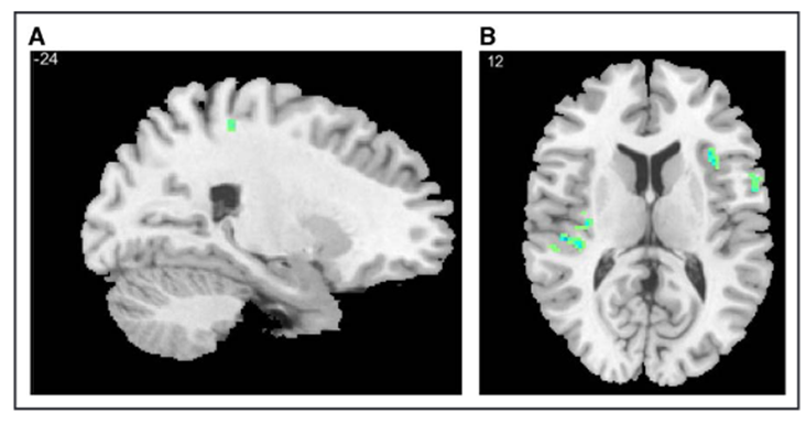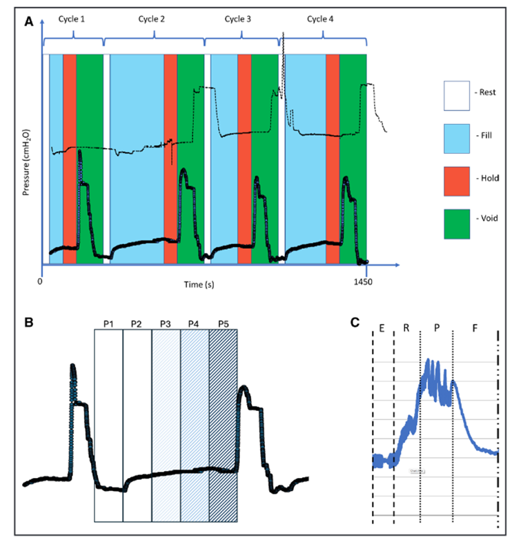 在自主收缩期间,与执行控制相关的区域(中央执行网络[背外侧前额叶皮层和后扣带皮层])在收缩即将开始时变得活跃,而显著性网络保持其活动,ACC的背侧部分(行动评估)变得更加突出。在排尿开始时(上升期),与运动控制相关的结构变得更加活跃,BOLD信号在中脑和背侧桥脑、额下回、辅助运动区和初级运动皮层中出现。所有ACC活动均向背侧转移,前额叶皮层活动减弱。显著性网络活动消失,感觉运动活动在平台期随着收缩的持续而减弱。另一方面,随着收缩的结束,脑干再次变得活跃(可能对应于括约肌关闭),信号再次出现在ACC的头端(预期而非行动),前额叶皮层中的执行功能中心保持活动。尽管该研究尚未发现其他研究评估膀胱收缩的不同组成部分,但研究整个收缩期间的调查人员也展示了与该研究在此处展示的相似区域的激活。