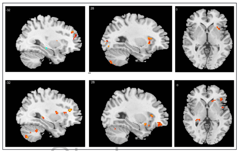 对比P4_VOL与P3_VOL和P5_VOL与P3_VOL发现,在P4期间双侧前部和左侧背侧扣带回皮质(ACC)激活;在P5期间右侧岛叶、双侧背侧ACC、右侧中部扣带回皮质激活。在此期间还观察到小脑激活(图2)。