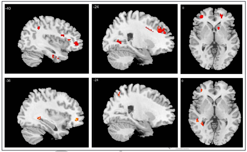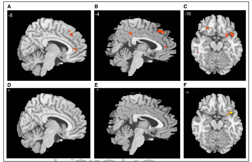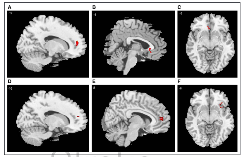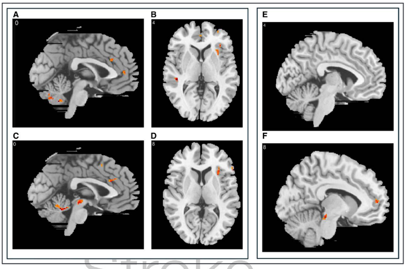 中风(上图)和健康(下图)参与者在自主逼尿肌收缩期间血氧水平依赖性效应变化的代表性矢状面和轴向图像。请注意,在2种不同患者表型的意志收缩过程中,背外侧前额叶皮层(A/D)、基底节(B/E)和岛叶(C/F)的激活是一致的。