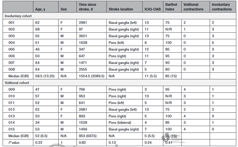 表1 卒中参与者的人口统计学、医学和尿动力学特征