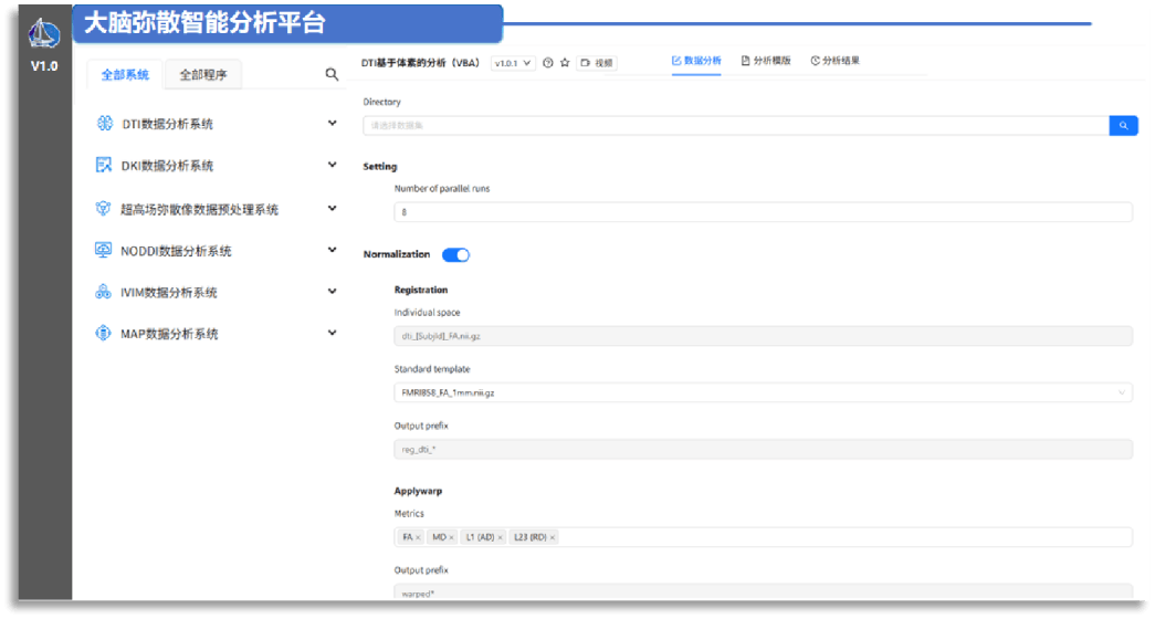 该系统提供完整的DKI数据预处理、基于体素的指标分析,以及基于白质骨架的跨组统计比较(TBSS)。同时,它支持基于DKI模型的确定性纤维追踪与结构网络构建,为研究脑肿瘤、神经退行性疾病等导致的复杂白质微结构变化提供了比传统DTI更具信息量的高级分析手段。