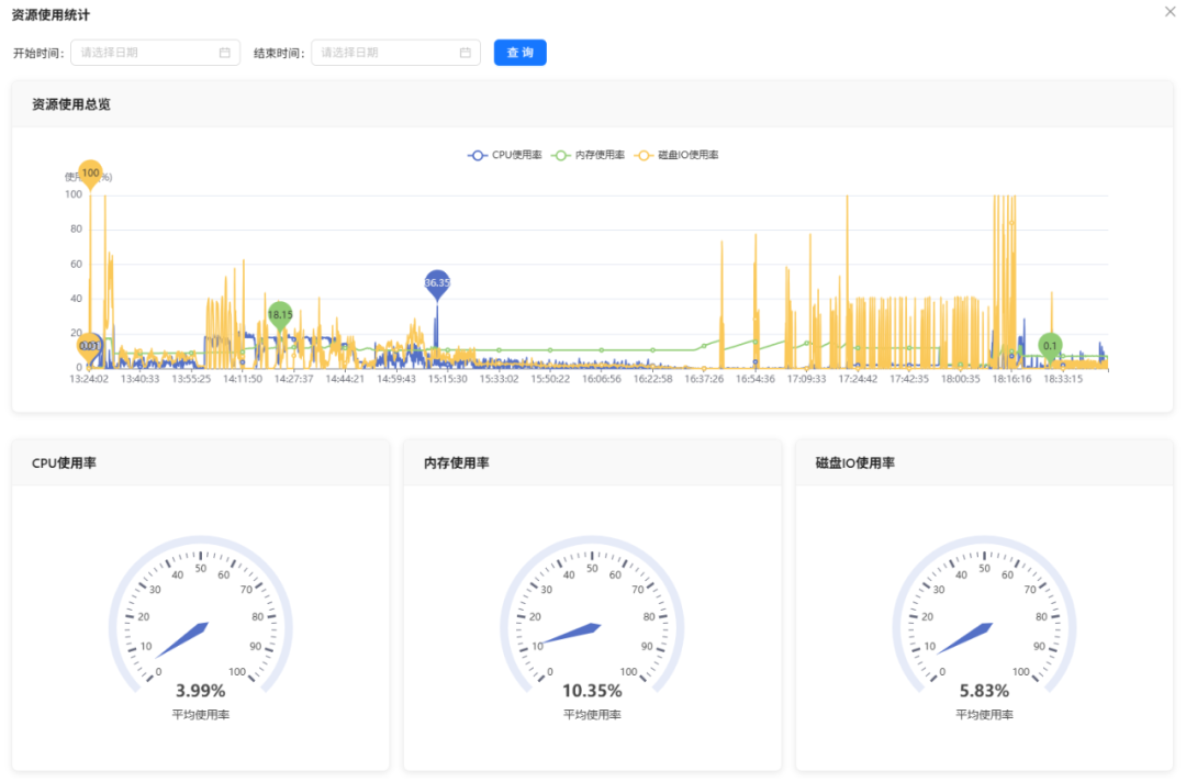 监控任务占用的CPU、内存、磁盘IO等平台资源,可查看使用趋势与详情。