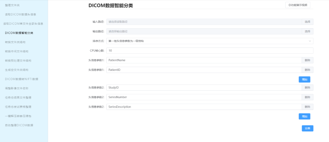 1. DICOM影像文件智能分类:依据多种序列的描述、患者ID等多维头信息,将散乱影像自动归档至预设文件夹,避免手动分类纰漏。