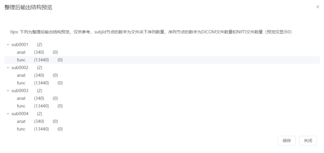树状结构展示:一键展开所有文件夹层级,直观呈现被试数量、序列分布及各文件夹下的影像文件明细,便于快速识别数量缺失或异常。
