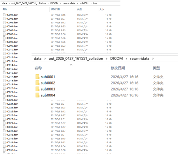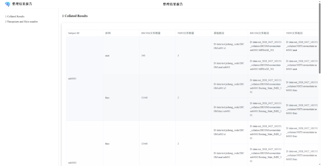 执行后输出数据整理报告,内含影像文件夹本地信息、影像头信息,输出分类整理后的DICOM与NIFTI文件,更改记录表。
