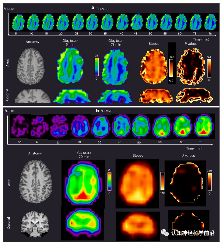 研究发现,质子核磁共振成像在7T下比氘核磁共振成像具有更高的灵敏度、化学特异性和时空分辨率。研究人员在5名志愿者中通过使用氢质子磁共振波谱成像来区分在特定分子位置的氘代的谷氨酸、谷氨酰胺、γ-氨基丁酸和葡萄糖,并同时绘制氘化和非氘化代谢物。氢质子磁共振波谱成像是一种适用于临床可用的磁共振硬件的技术,可以促进大脑中葡萄糖代谢及其在神经系统疾病中的潜在作用的研究。