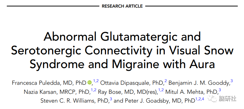 Puledda F, Dipasquale O, Gooddy BJM, Karsan N, Bose R, Mehta MA, Williams SCR, Goadsby PJ. Abnormal Glutamatergic and Serotonergic Connectivity in Visual Snow Syndrome and Migraine with Aura. Ann Neurol. 2023 Jul 19. doi: 10.1002/ana.26745. IF: 11.2 Q1资讯来源