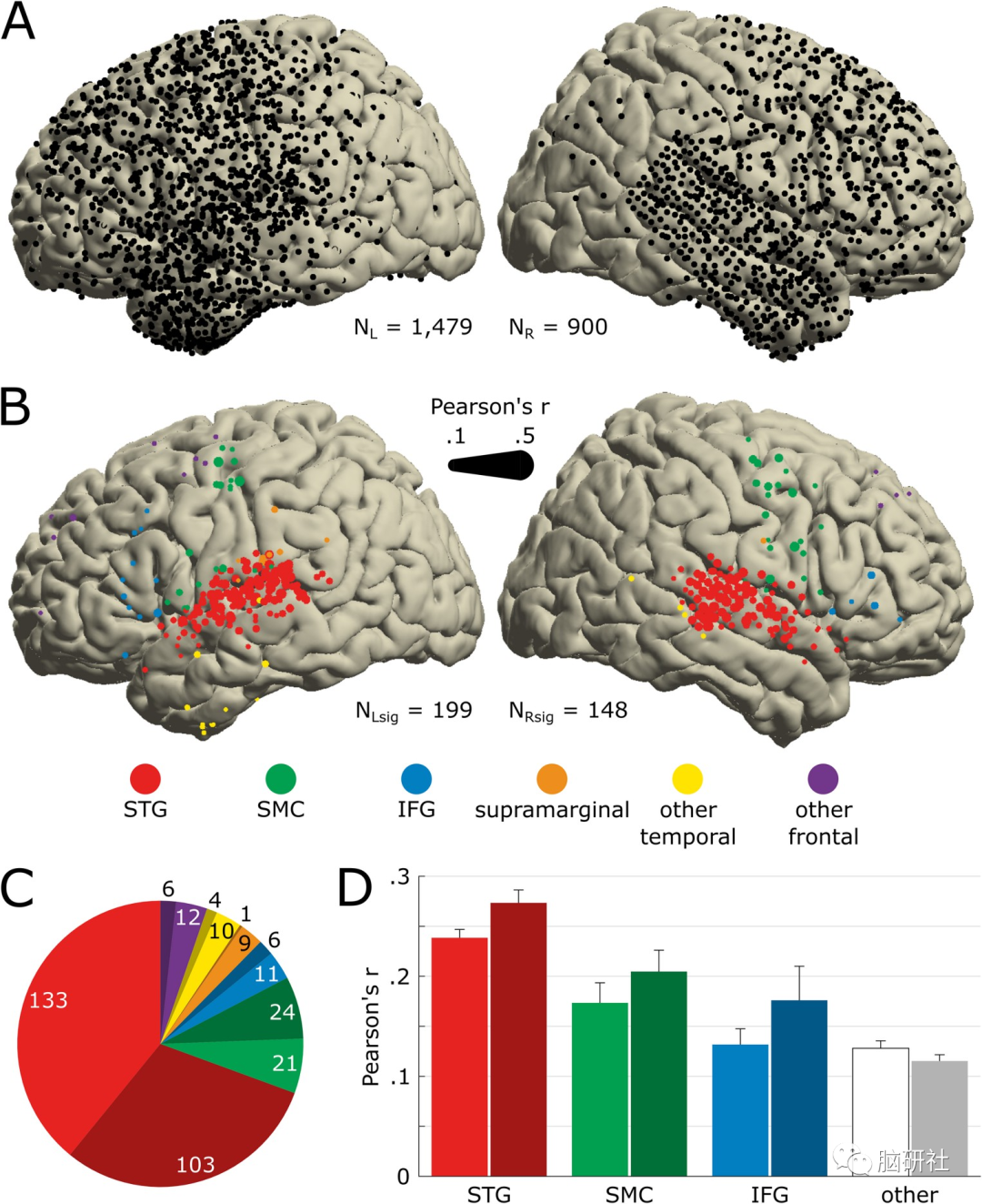 研究人员发现,347个显著电极中的大多数(87%)集中在 3 个区域:68%在双侧颞上回(STG), 14.4%在双侧感觉运动皮层(SMCs,位于中央前和后回),4.6%在双侧 IFG。研究人员还证实,右脑比左脑更能适应处理音乐方面的信息。
