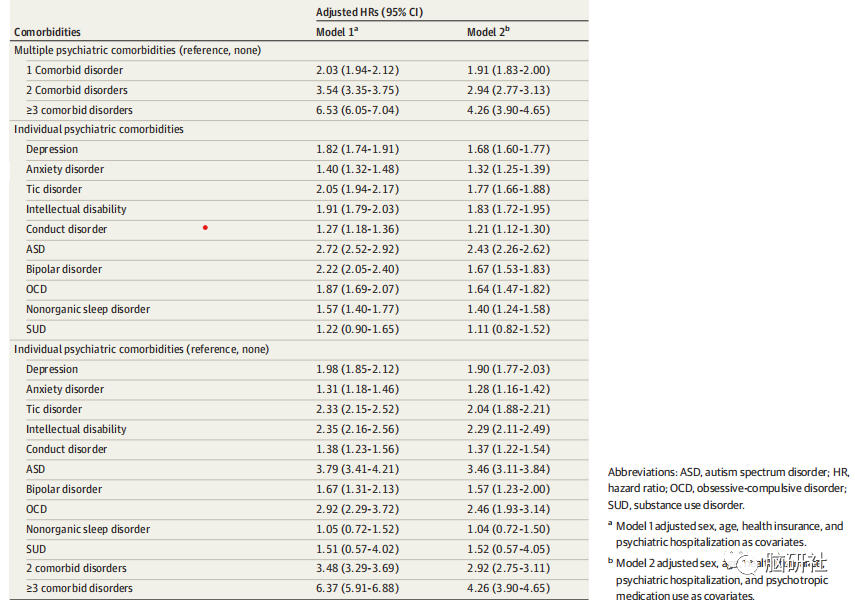 注意缺陷与多动障碍(ADHD)俗称多动症,发生于儿童时期,其主要特征为注意明显集中困难、注意持续时间短暂、活动过度或冲动。多动症是在儿童中较为常见的一种障碍,其患病率一般报道为3%-5%,男女比例为4:1。近年来,ADHD与精神分裂症之间的关联受到越来越多的关注。然而,关于多动症患者精神共并症与随后的精神分裂症之间关联的研究寥寥。2023年11月1日,韩国济州国立大学 的Soo Min Jeon博士和庆北大学的SangHun Cha博士及其团队在JAMA Network Open(IF=13.8)上发表了题为“Psychiatric Comorbidities and Schizophrenia in Youths With Attention-Deficit/Hyperactivity Disorder”的文章,研究表明:患有注意缺陷与多动障碍 (ADHD) 的年轻患者存在精神共并症,与被诊断为精神分裂症的较高风险相关。 该研究总共纳入了 211 705 名新诊断的 ADHD 患者。157 272 名患者(74.3%)为男性,年龄分布最高的是 5 至 9 岁。患有精神共并症的患者被诊断为精神分裂症的风险明显高于没有精神合并症的患者。随着合并症数量的增加,精神分裂症与精神共并症之间的关联性逐渐增强。几种精神疾病与精神分裂症的发展存在关联,其中包括自闭症谱系障碍(ASD)、智力障碍、抽动障碍、抑郁症和双相情感障碍五种最为相关的疾病。此外,3244 名没有精神共并症的患者在精神分裂症发生之前也经历过其他精神疾病。
